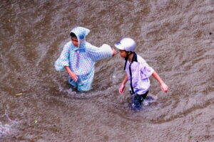Il semble, selon les habitants, que les inondations soient une réalité de la vie à Hue. Chaque année, la région est frappée par de fortes pluies. Les habitants acceptent cela sans se plaindre, arborant un sourire lorsqu’ils traversent ces étendues d’eau qui entravent leur chemin.
