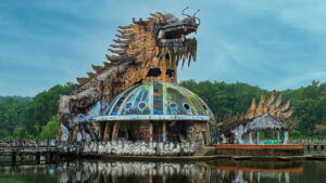 Il s’agit d’un vaste parc comprenant un orgue d’eau, un parc aquatique, des bungalows hotels, un restaurant et de magnifiques sentiers de randonnée qui entourent un lac spécialement aménagé pour le parc. Malheureusement, le promoteur a fait faillite et depuis lors, le parc est à l’abandon. Les graffitis ont été réalisés par un groupe d’amis appelé les “Taggers-Rappers” de Hue. Cependant, ici, cela n’est pas considéré comme du vandalisme.